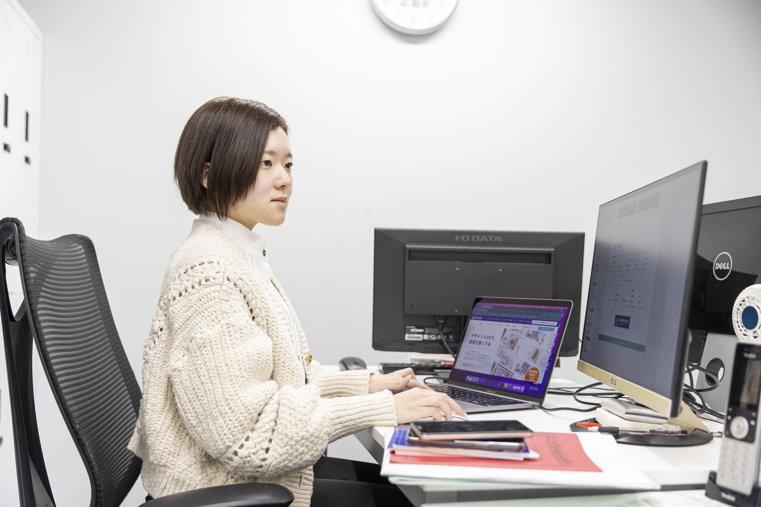 webサイトのデザインを中心に、チラシやパンフレット、ロゴ、名刺、時には展示会用のスタンドバナーなど、様々な業種のデザインに携わっています。ディレクターから案件の共有を受け、時にはデザイナー同士やディレクターとも相談しつつ、より良いデザイン制作となるように取り組んでいます。